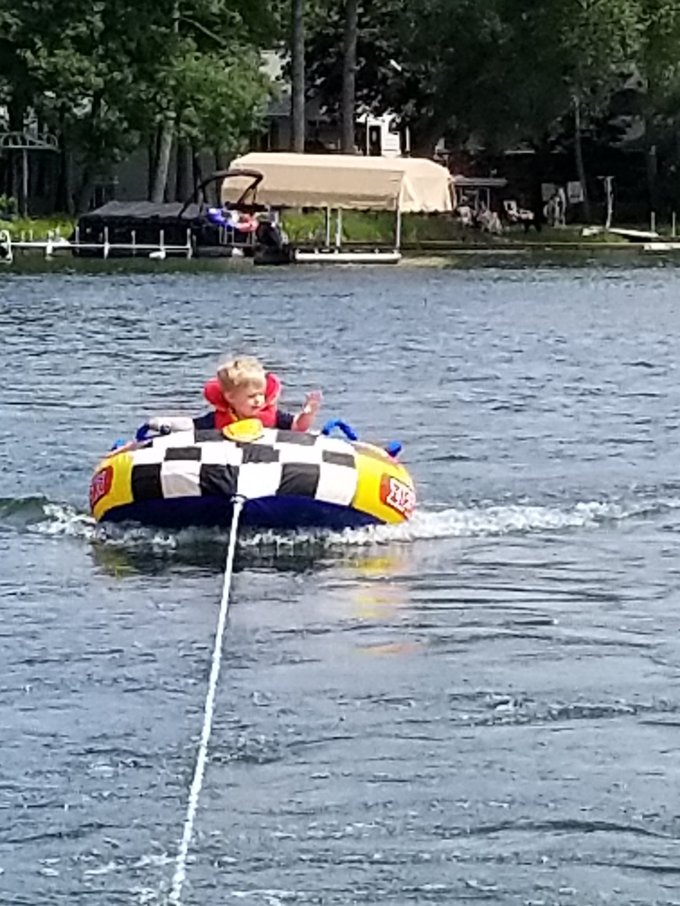 From the “structured” aspect we have tried to give him a lot of opportunities to explore around the water. We are water people, particularly me. My wife enjoys her time at the water but only when it’s warm (not frozen). He’s taken several sessions of swimming lessons and is very comfortable around water. Been fishing several times both on the ice and on the boat. He caught a 20″ northern with grandpa over the 4th of July, mostly him but obviously needing grandpa’s help. This spring/early summer I decided he was ready to hop in the tube behind the boat on his own. Mom was on board with this, others were shocked we would do such a thing. He was super excited to do it. We had his life jacket on and I was driving the boat on a slower weekend at the lake. My speed was also very slow, just enough to get him moving. He loved it, which is what we hoped for. Create a positive experience in a place we enjoy. Grandpa took me and Layton behind his boat tubing over the 4th of July, on separate tubes; he went a bit faster than I did, at Layton’s request. It was great until Layton started getting sprayed in the face with water from the rope. Overall a positive experience so we were both happy. When Layton was done on the tube he got to enjoy watching grandpa throw his son-in-law (me) off the tube. I think he enjoyed that more than riding in the tube, after he knew I was ok.